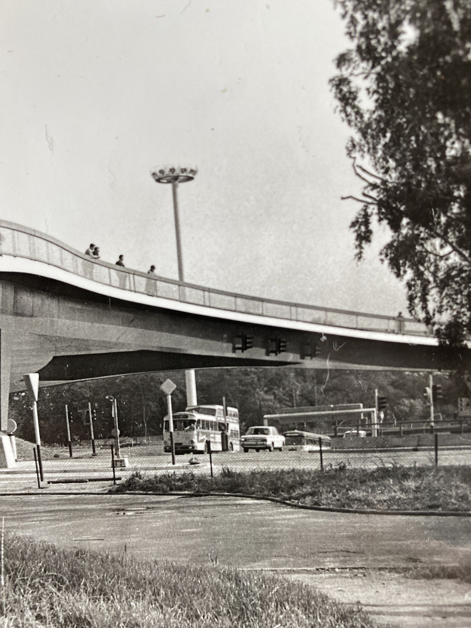 Die Y-Brücke verbindet den Busbahnhof und City C mit dem Rathaus, dem Stadthaus und der City A (den heutigen Luminaden). Man beachte die KVB-Buslinie 52: Ein halber Doppeldecker.