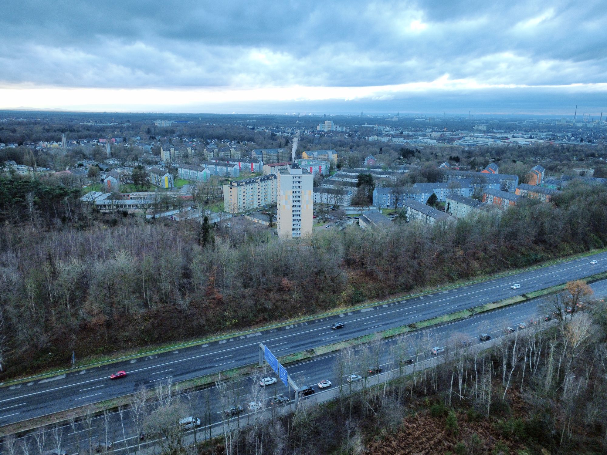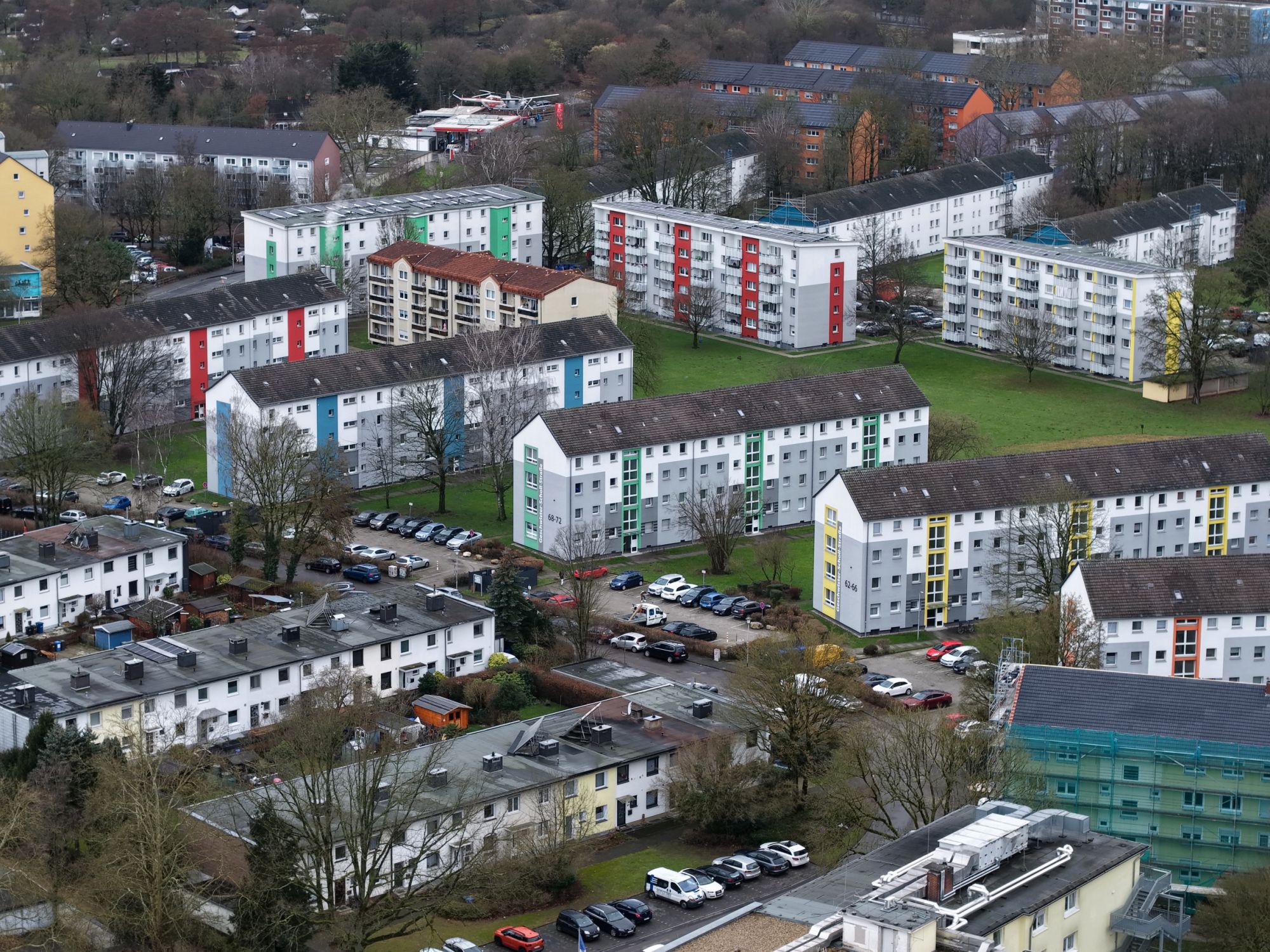 Drohnenfoto in Richtung Schollstr. 78 am 26-01-2025. Die Wohnblöcke haben eine zweite Renovierungsphase durchlaufen.